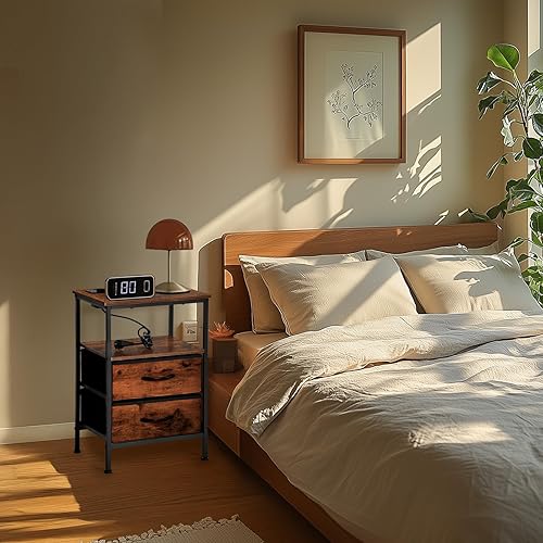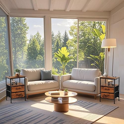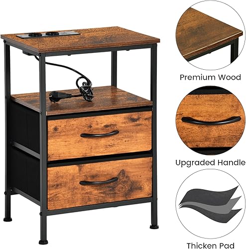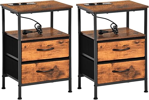 EGGREE Lot de 2 Tables de Chevet avec Station de Charge, Petite Table de Chevet avec tiroirs en Tissu et étagère pour Chambre à Coucher, Petits espaces, Table de Chevet avec Ports USB et Prises.