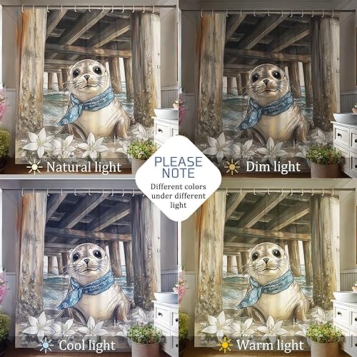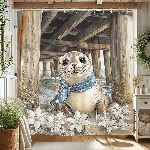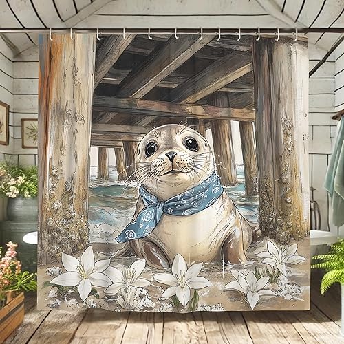 Adorable rideau de douche en tissu imperméable, motif phoque, animal marin, décoration de salle de bain, style plage nautique, avec crochets, 183 x 198 cm