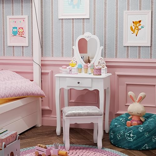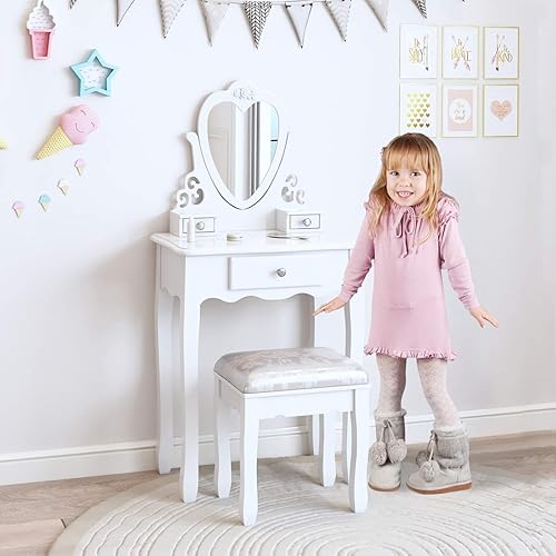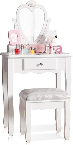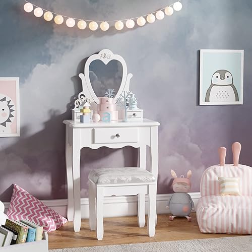 Jooli H Coiffeuse blanche pour enfants avec miroir et tabouret, miroir rabattable en forme de cœur et 3 tiroirs, bureau de maquillage pour filles de 3 à 9 ans