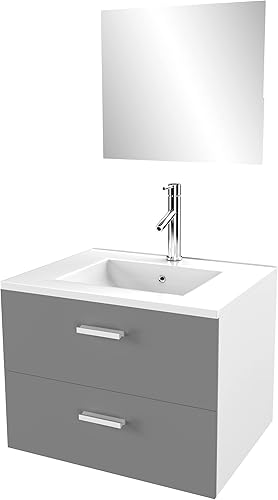 AURLANE Meuble Salle de Bain 60 cm Suspendu 2 tiroirs Gris avec Vasque et Miroir - Box-in 60 Grey