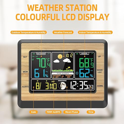 OBEST Station Météo LCD Écran 6 Pouces Interieur Exterieur Sans Fil,Alarme de Température/Humidité, Réveil Snooze,un Capteur, Convient pour Bureau, Chambre de Bébé,Jaune