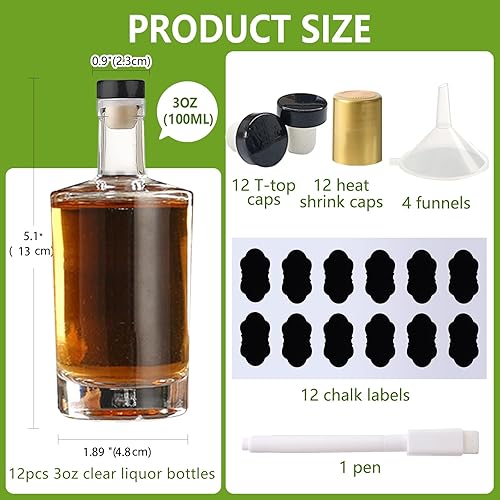 YBCPACK Lot de 12 bouteilles en verre de 100 ml à remplir, petites bouteilles d'alcool avec bouchons, bouchons rétractables, entonnoirs, étiquettes – Bouteilles de liqueur vides parfaites pour les