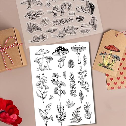 craspire Tampons Transparents en Forme de Champignon pour la Fabrication de Cartes Fournitures de Scrapbooking, Pommes de Pin Tampons Clairs Fleur Lis Ginkgo Feuilles Tampons Transparents
