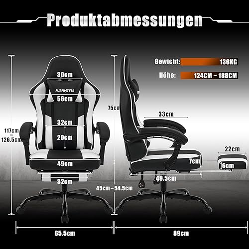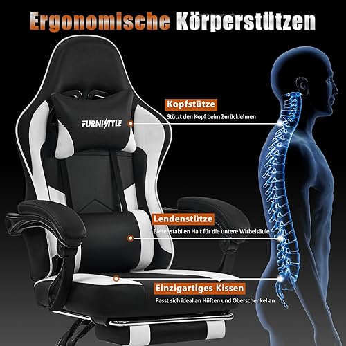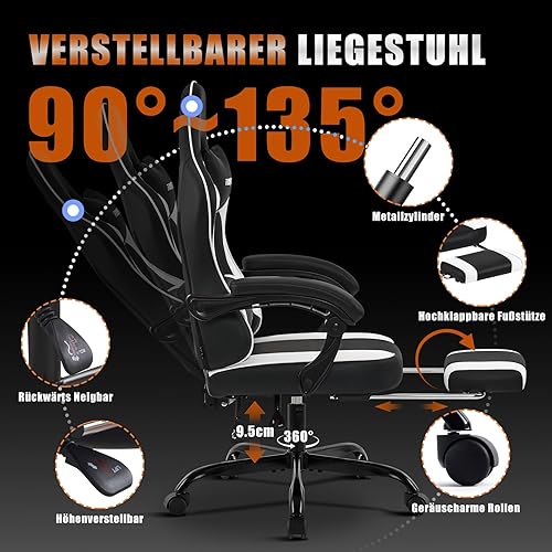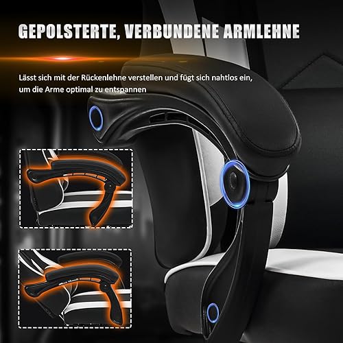 Chaise Gaming Ergonomique avec Repose-Pieds, Fauteuil de Bureau Réglable en Cuir PU, Support Lombaire, Accoudoirs Synchronisés, pour Adultes et Adolescents, Noir et Blanc