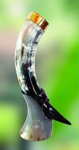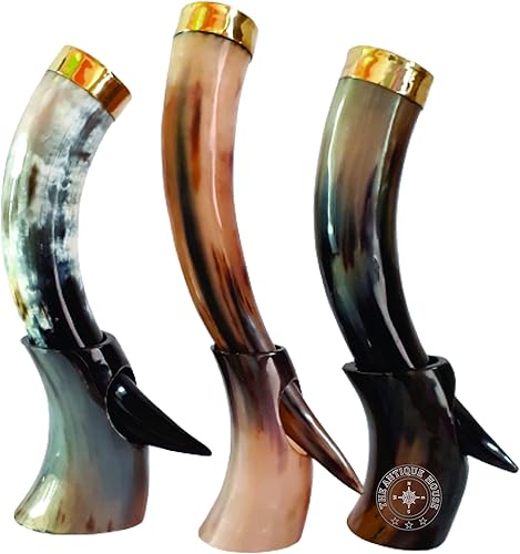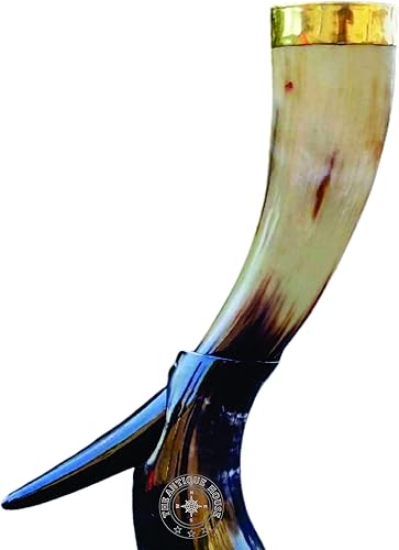 THE ANTIQUE HOUSE Corne à boire Viking en corne de bœuf avec support en corne et bord en laiton Cadeau de Noël/anniversaire/fête des pères