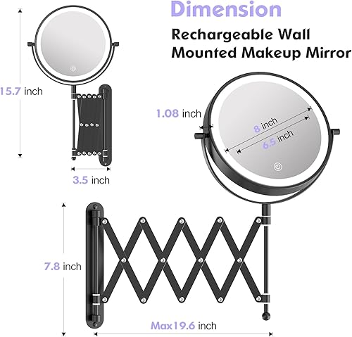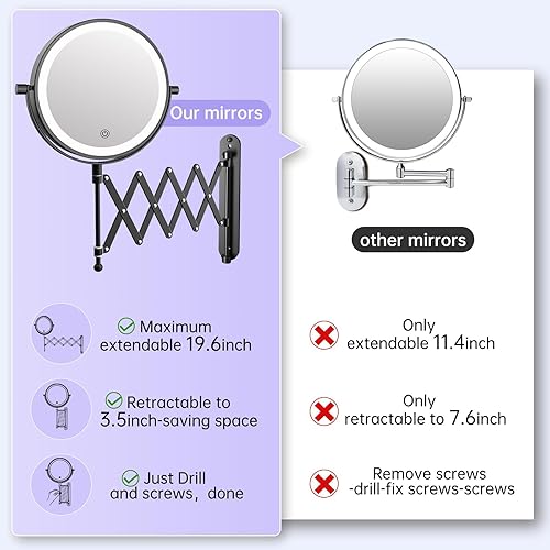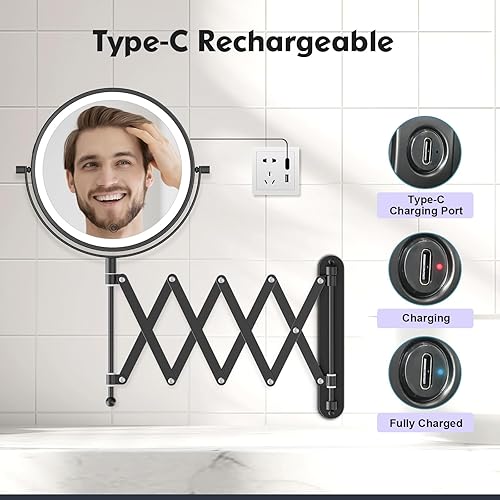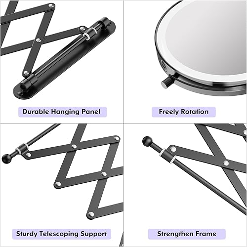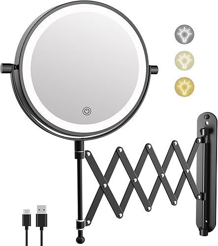 FUNTOUCH Miroir cosmétique rechargeable avec grossissement 1X/10X, éclairage en 3 couleurs, miroir de maquillage, bras allongé, rotatif à 360°, miroir mural pour salle de bain et hôtel (noir)