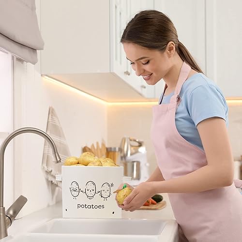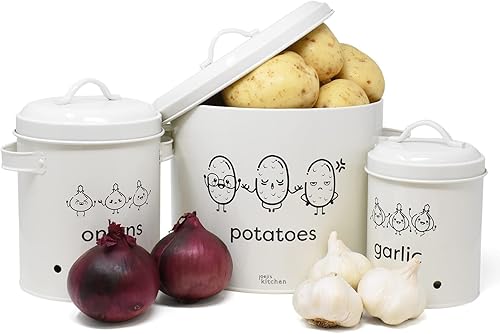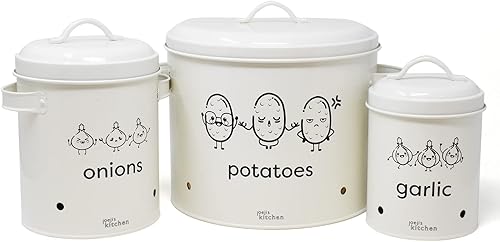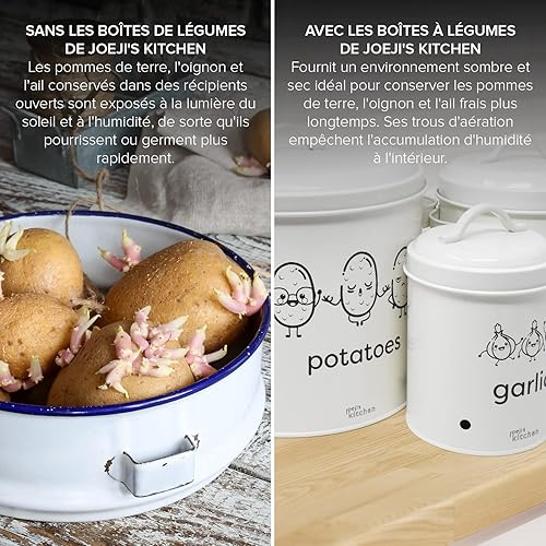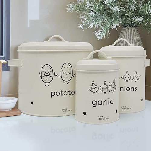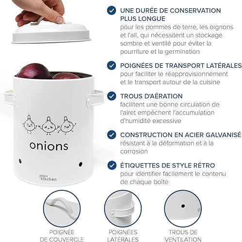 Joejis rangement pomme de terre oignon ail Lot de 3,Métal boite oignons ail echalotte avec couvercle avec circulation d'air à 360°- Rangement Pomme de Terre - Creme