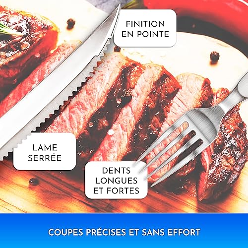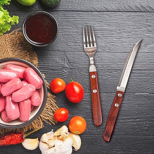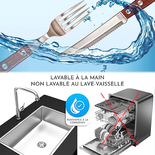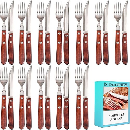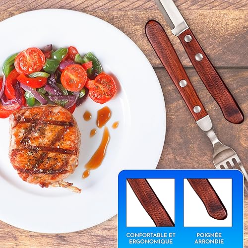 Couverts à steak Acier inox bois 24 pieces avec 12 couteaux à steak et 12 fourchettes à steak