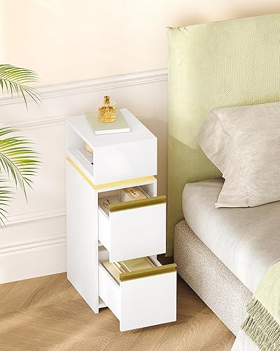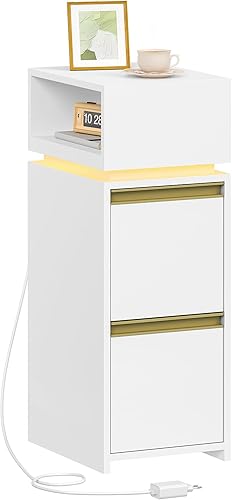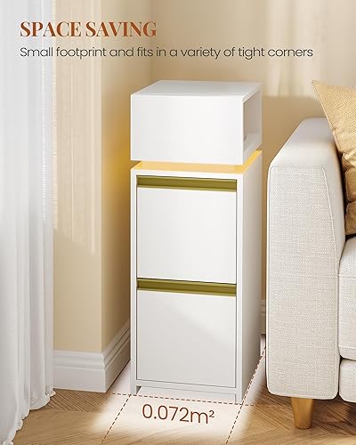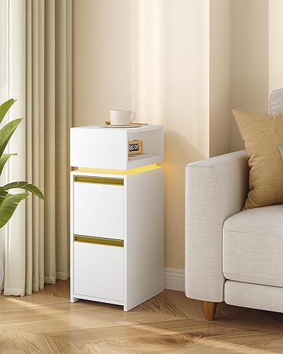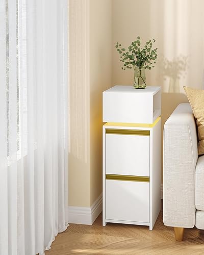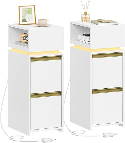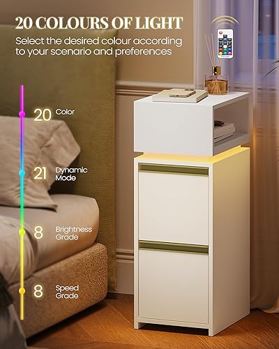 HEXCELEN Table de Chevet Étroite, Tables de Chevet avec Lumière LED, Tables de Nuit avec 2 Tiroirs et 1 Compartiment Ouvert, Table d'appoint, pour Chambre à Coucher, Salon, Moderne, Blanc