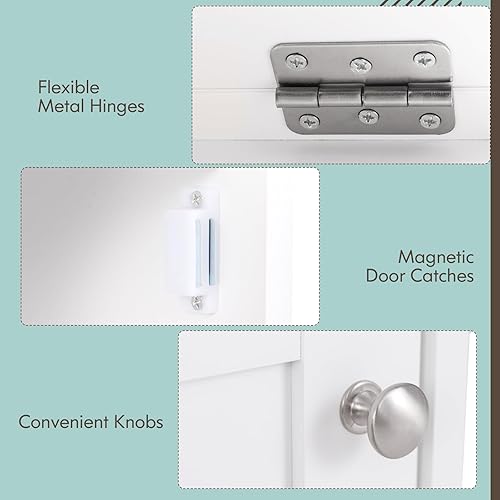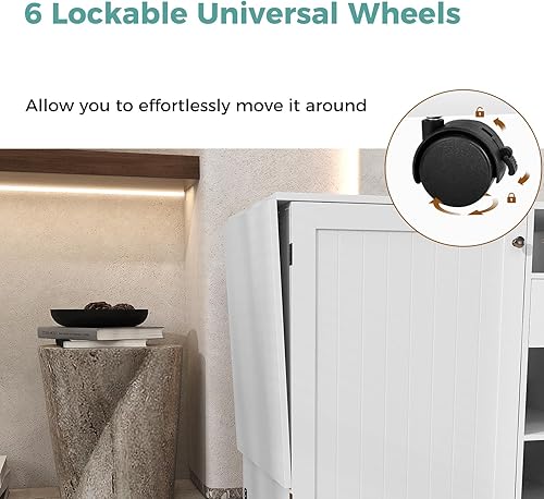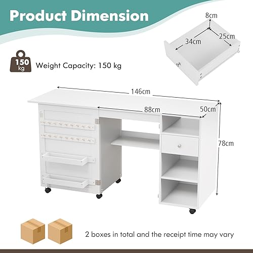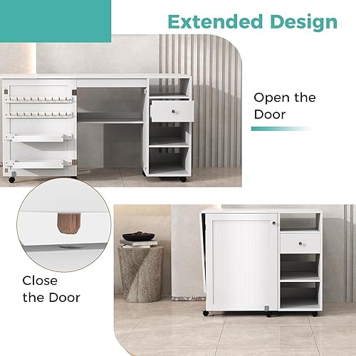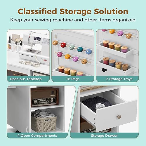 LIFEZEAL Table de Couture Pliante, Armoire pour Machine à Coudre avec Etagères de Rangement, Crochets, Bureau de Couture Réglable avec 6 Roues Verrouillables, Design Compact, Blanc