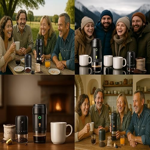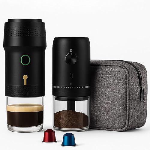 Set cafetière portable capsules + moulin à café électrique avec batterie rechargeable + sac de transport imperméable | Compatible avec capsules Nespresso, Dolce Gusto et café moulu | Cafetière express