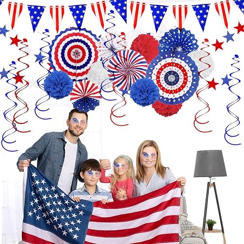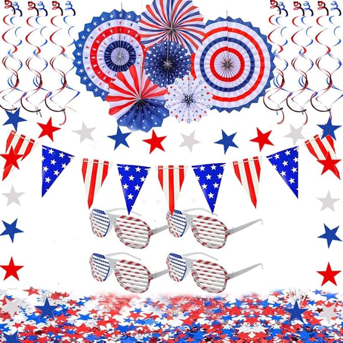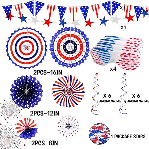 Lot de décorations de fête patriotique du 4 juillet - Rouge et blanc - Bleu - Pour fans de papier - Serpentins américains - Fanions américains - Verres en plastique patriotiques pour 4 juillet