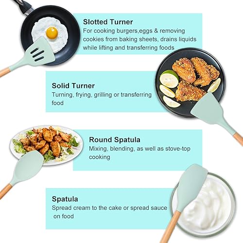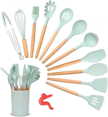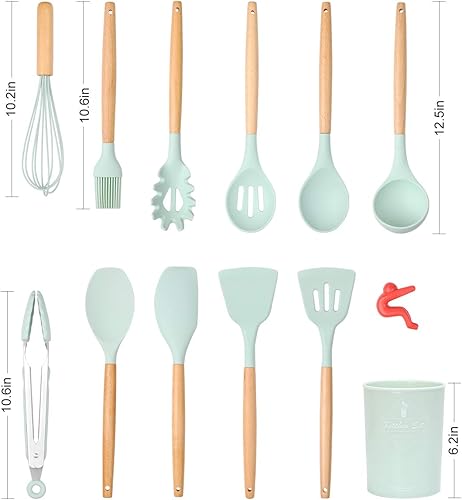 Songway 12 PCS Kit d'Ustensiles de Cuisine en Silicone et Bois avec Pot de Rangement, Set d'ustensiles de cuisine en silicone