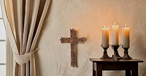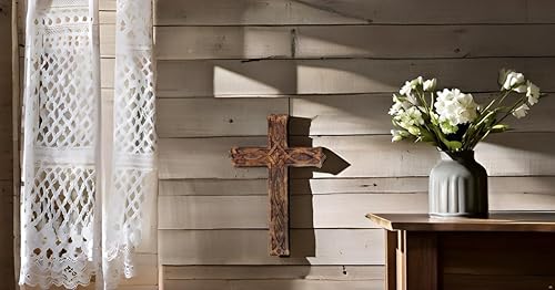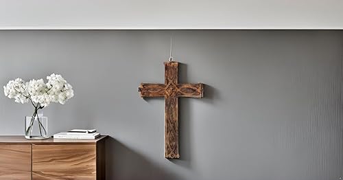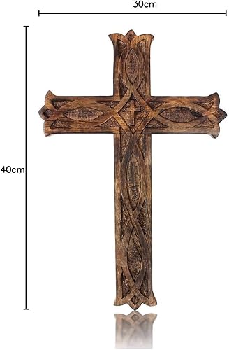 Crucifix religieux catholique en bois à suspendre - 40 x 30 cm - Plaque française sculptée florale - Décoration d'intérieur - Église - Chapelle - Décoration murale - Finition rustique antique