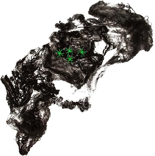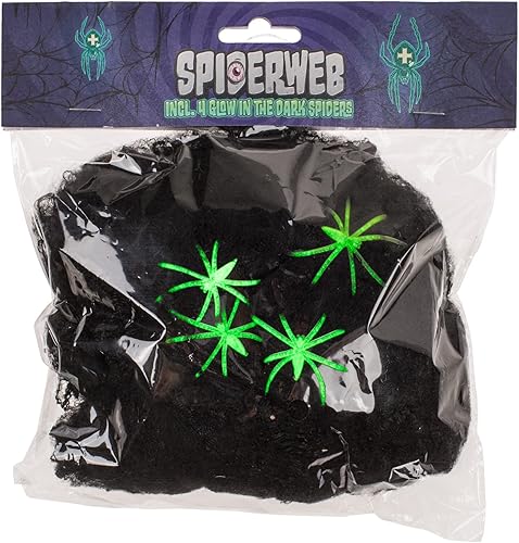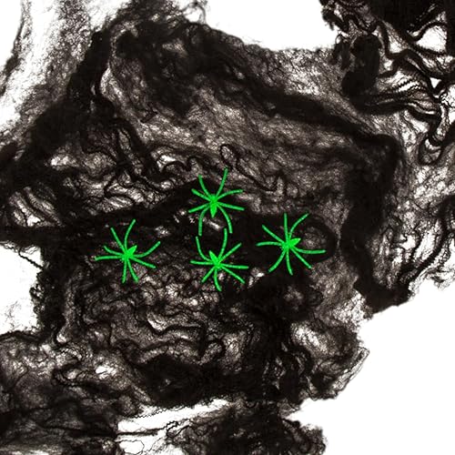 MIJOMA Toile d'araignée artificielle 28 g pour décoration effrayante d'Halloween - Comprend 4 araignées en plastique - Filet réaliste pour 6-8 m² (noir)