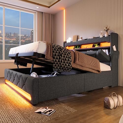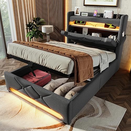 Seyakany Lit rembourré Simple 90x200cm avec Ports USB et Type-C,Lit Coffre 90x200 avec éclairage LED et hydraulique Rangement,Cadres de lit 1 Place avec sommier,Tissu de Lin,sans Matelas,Beige