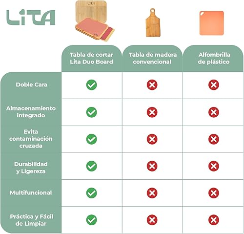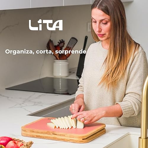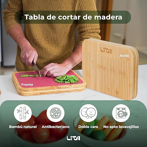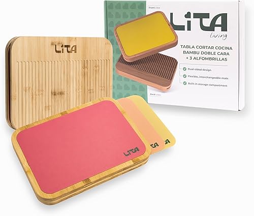 Lita Store Planche à découper multifonction en bois de bambou avec 3 tapis interchangeables flexibles PP Ustensiles de cuisine Double face Sans BPA