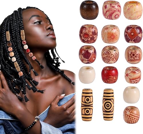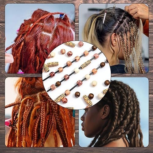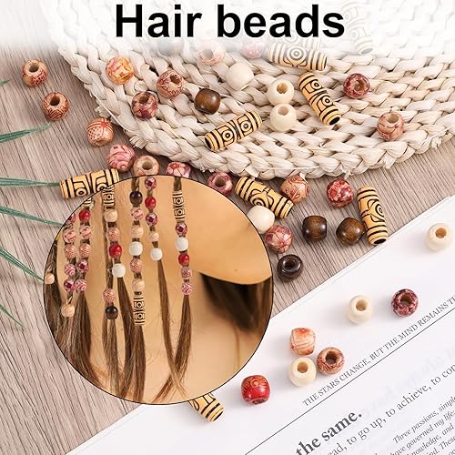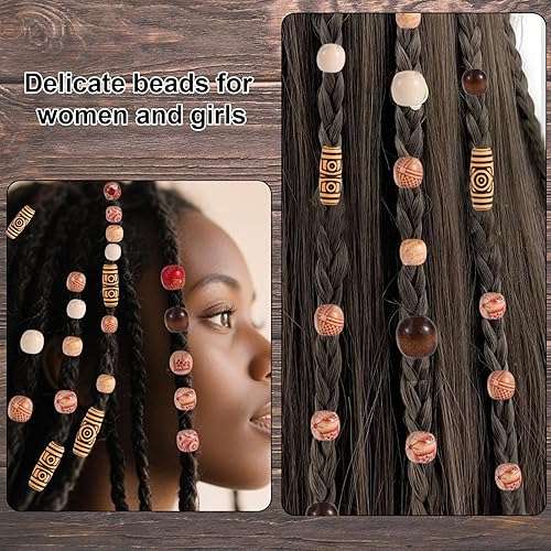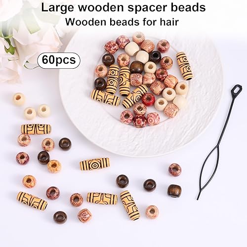 60pcs Perles Cheveux bois pour Tresses, Rétro Multi-Formes Dreadlocks Perles Tressées pour Accessoires Capillaires Faits Main Bricolage Fabrication de Bijoux