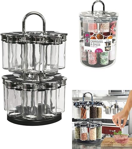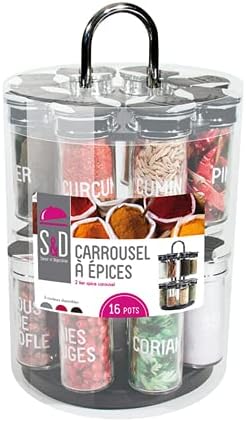 S&D Saveur et Dégustation KB5669 Carrousel à épices Distributeur rond rotatif 16 pots 2 étages Noir gris et transparent Plastique et verre Couvercles double clapets D19 x H31,5 cm