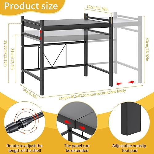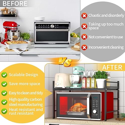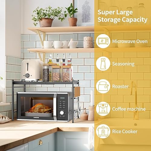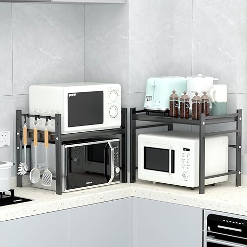 CIRULLI Etagere micro ondes extensible à 2 niveaux, etagere micro onde vertical avec 4 crochets en S,support de cuisine pratique pour plan de travail, organisateur de cuisine, noir