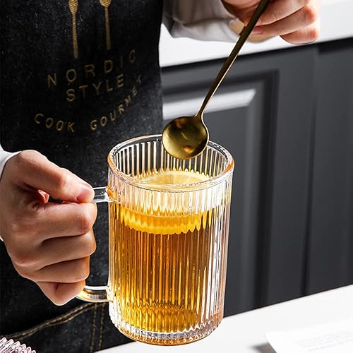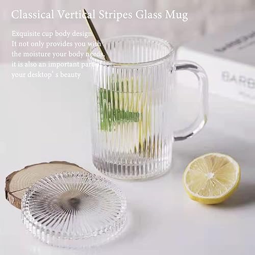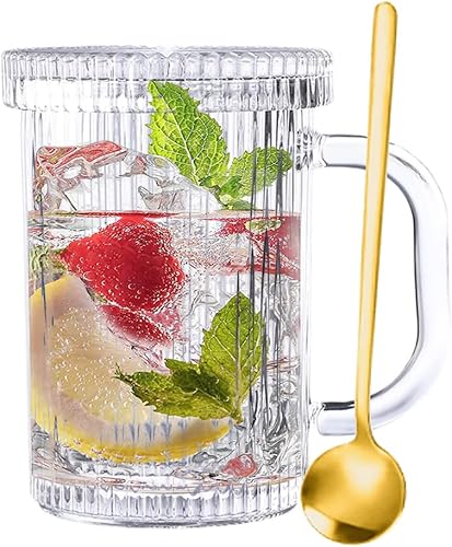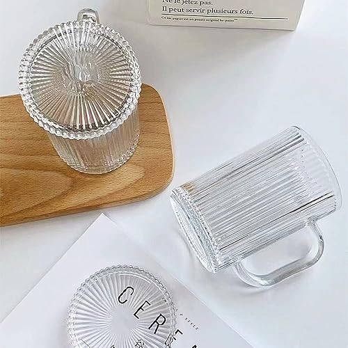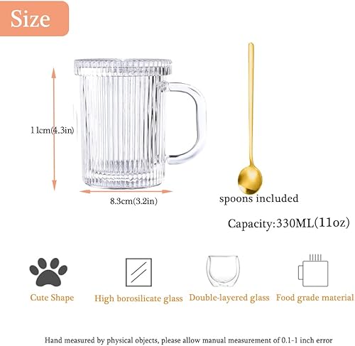 Tasse à café en verre transparent avec couvercle, Tasse à thé classique à rayures verticales avec cuillère, pour Latte, Thé, Chocolat, Jus, Cadeau pour les femmes Les filles Hommes, Noël, 11OZ