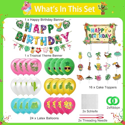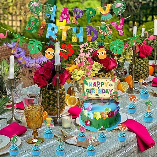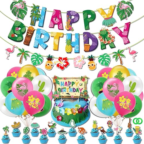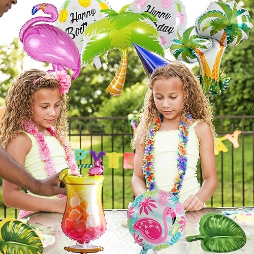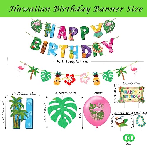 Décorations de Fête Hawaïennes, Flamant Ballons Tropicaux avec Happy Birthday Bannière, Decoration Anniversaire Tropical, Bannière Joyeux Anniversaire Hawaïen pour Tropicaux Piscine Plage D'été Fête