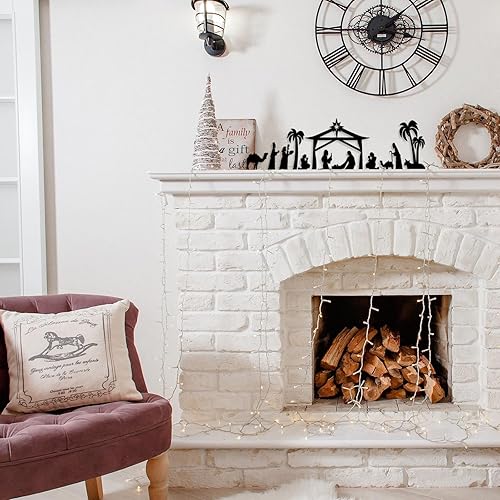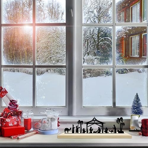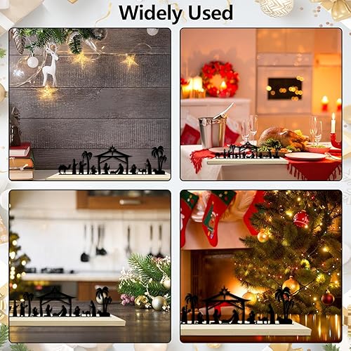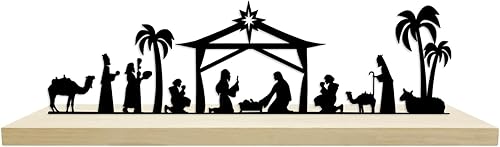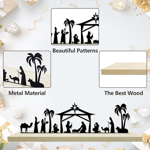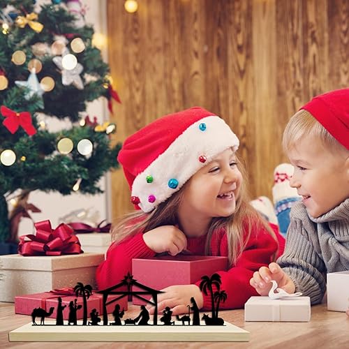 HINGTAI Décoration de crèche de Noël, crèche de Noël en métal Noir avec Base en Bois, décoration de crèche d'hiver,pour décoration de Table et d'étagère de Maison