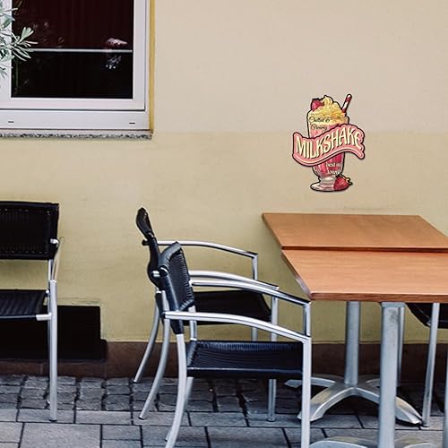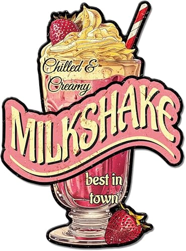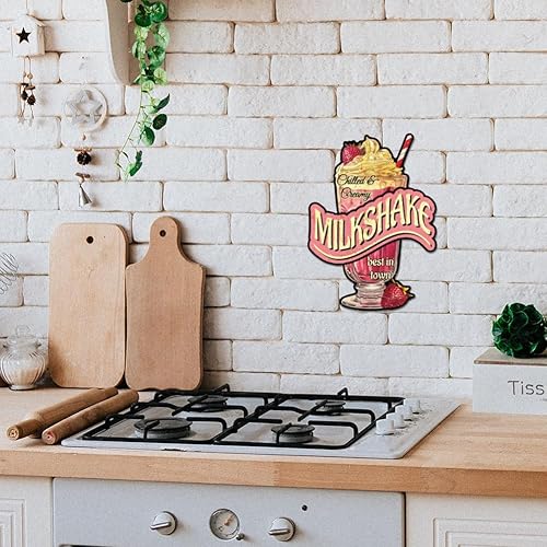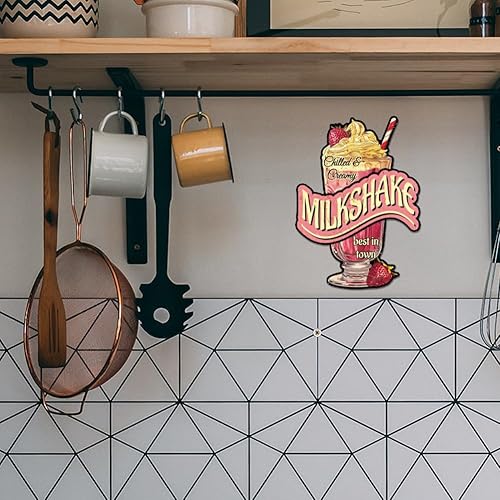 GLOBLELAND Plaque en métal milkshake « Chilled Creamy Milkshake Best in Our Town » - Décoration murale amusante pour salle à manger, restaurant, cafétéria, dessert, boulangerie, magasin de thé au lait