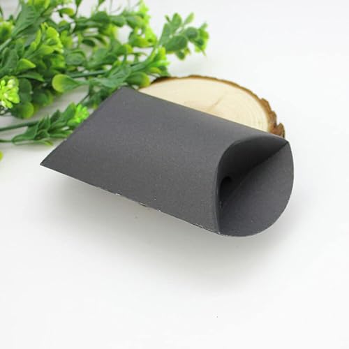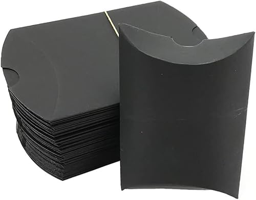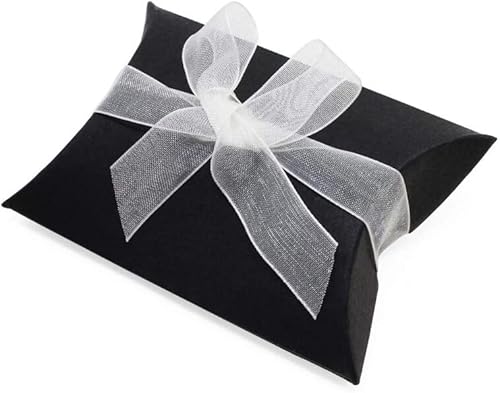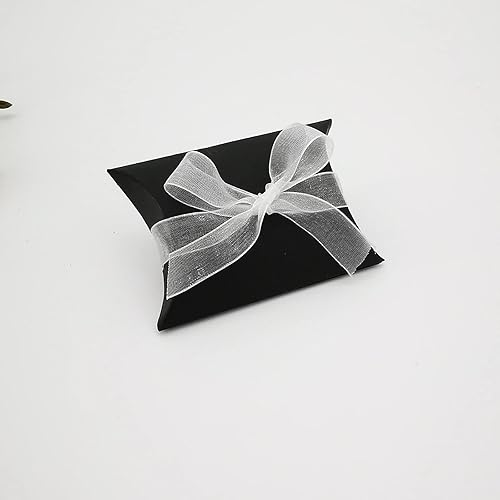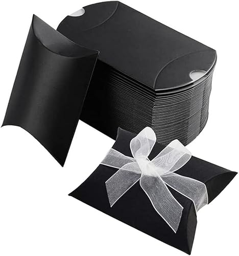 QUUPY Lot de 50 boîtes d'oreiller en papier kraft noir avec rubans, boîte à bonbons, emballage de bijoux, porte-cartes, savon, boîte cadeau pour fête prénatale