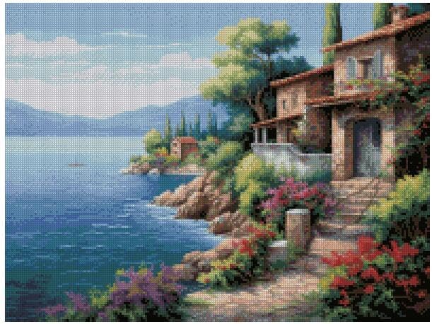 Lakeside Cottage Kit de broderie au point de croix compté 14 fils 100 % coton 200 x 150 points 36 x 27 cm Motif paysage 14 ct