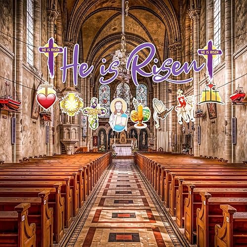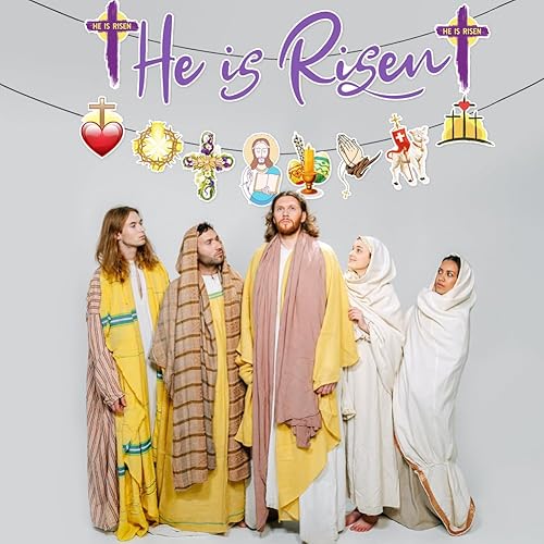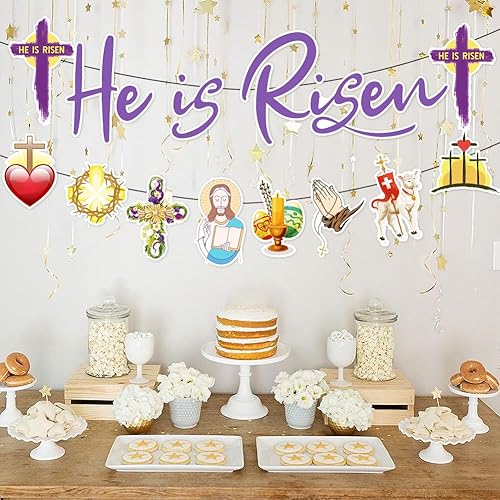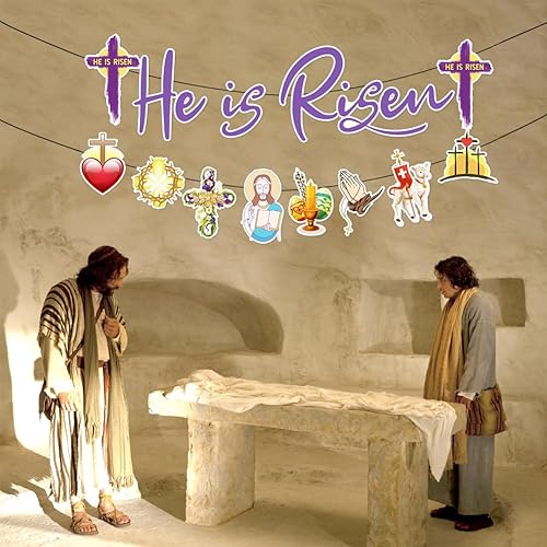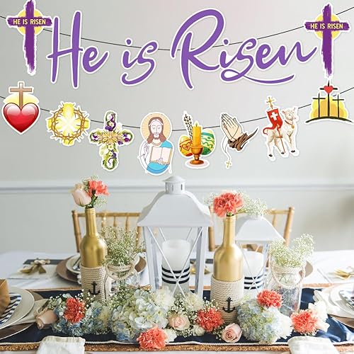 Bannière He is Risen, Violet Joyeux Jour de Pâques Croix Jésus Suspendu Banderoles Bannière Guirlande Décoration de Fête pour Fournitures de Décoration de Fête de Pâques Activités Religieuse