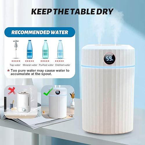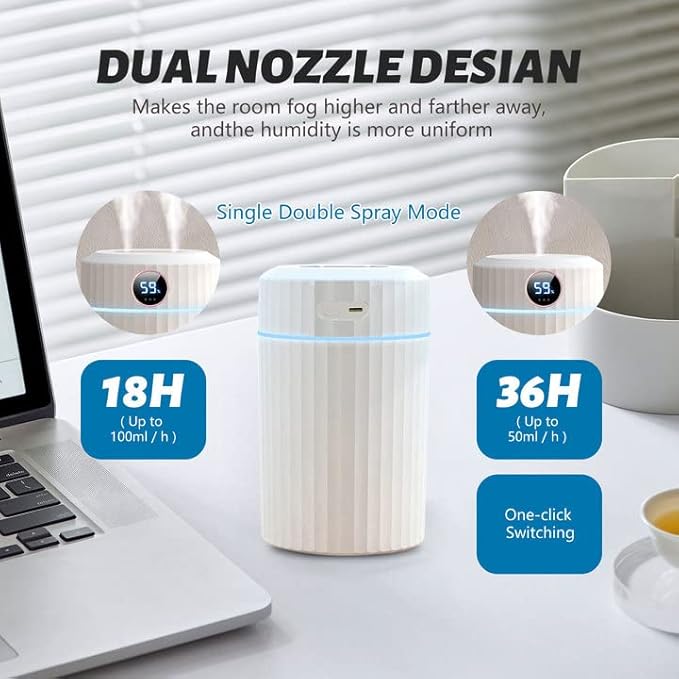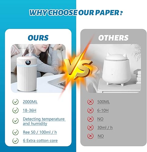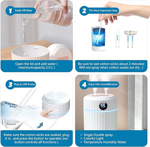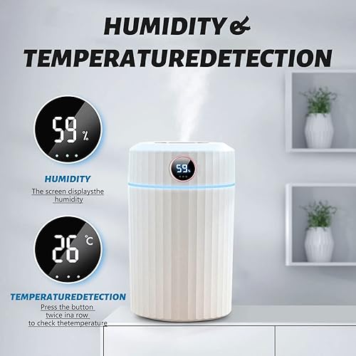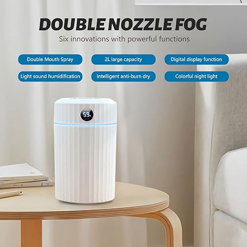 Humidificateur Top-Fill, 2L Humidificateur Ultrasonique Silencieux avec Thermo-Hygromètre Duple Buse 36 Heures Temps de Fonctionnement Arrêt Automatique 7 Types de Lumières pour Maison Chambre