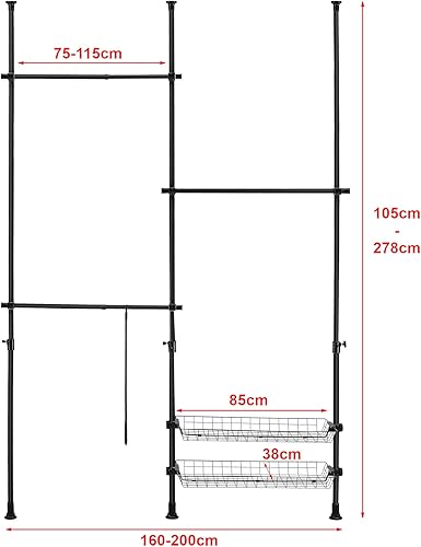 [en.casa] Penderie Télescopique Garde-Robe Mobile Porte-Manteau Ajustable avec 4 Barres de Penderie Système de Porte-Vêtements Réglable en Hauteur et Largeur Acier Laqué Plastique 150-230 cm Noir