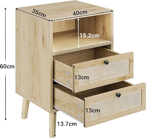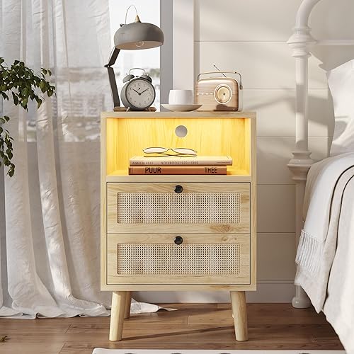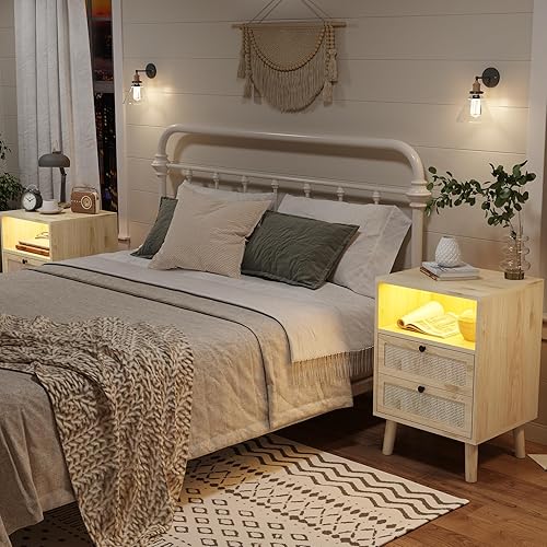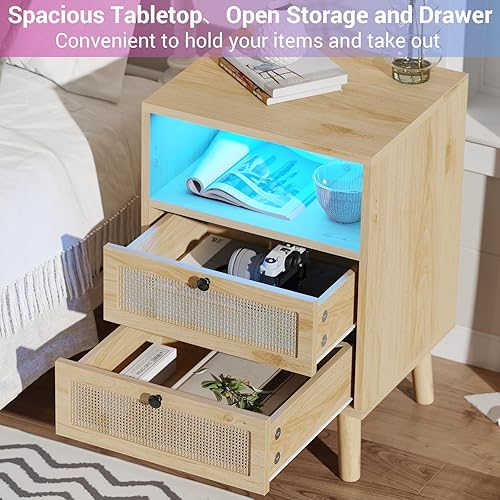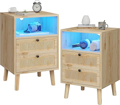 Lot de 2 Table de Chevet LED en Rotin et Bois,Tables d'appoint avec 2 Tiroirs et Compartiment Ouvert, Bohème avec Pieds en Bois Massif pour Chambre à Coucher, Salon, 40 x 35x 60 cm, Beige-Sans Prises
