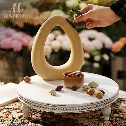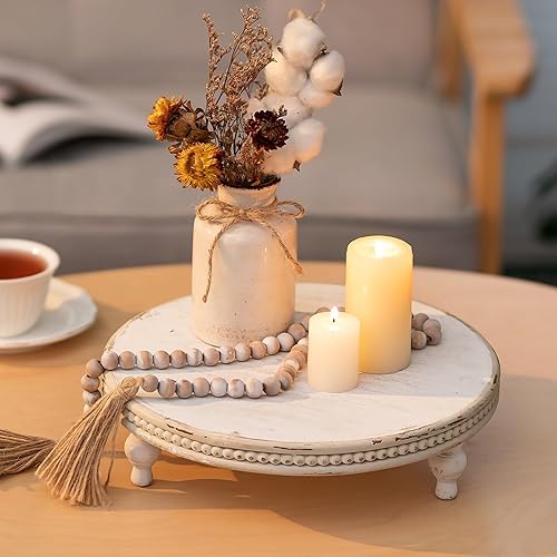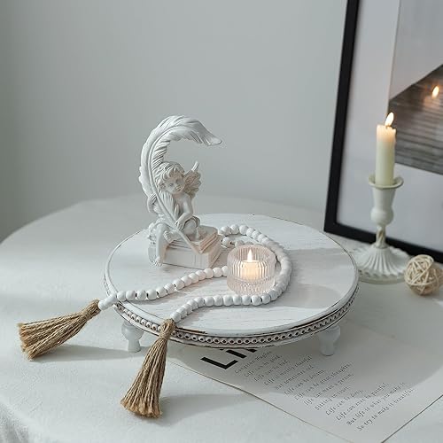Hanobe Plateau Bois Riser Decoratif: Rustique Rond Blanc Petit Plateau avec Pied Plateaux Table Basse avec Perles - Vintage Mini Plats Ferme Deco pour Repas Canapé Cuisine 30cm