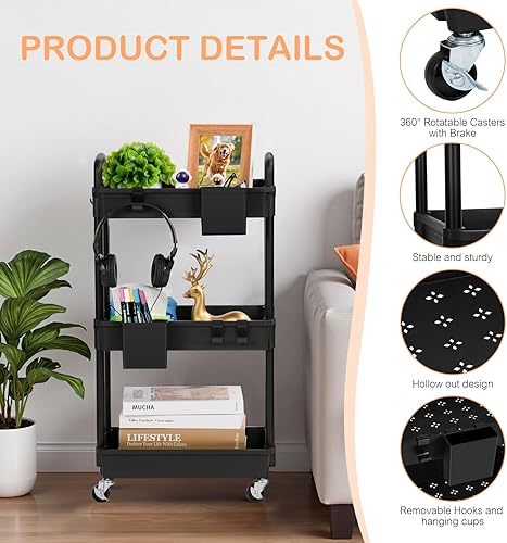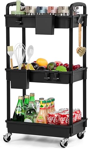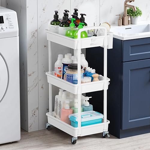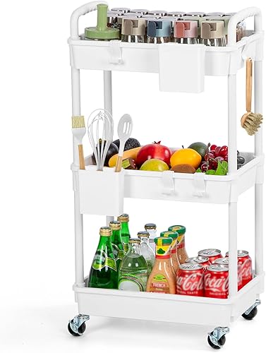 FoiiLiio Chariot de Cuisine a 3 Niveaux,Chariot Mobile,Chariots de Cuisine pour Salle de Bain,gobelets Suspendus supplémentaires,Étagère de Cuisine avec roulettes,pour Cuisine,Salle Bain,Bureau,Blanc