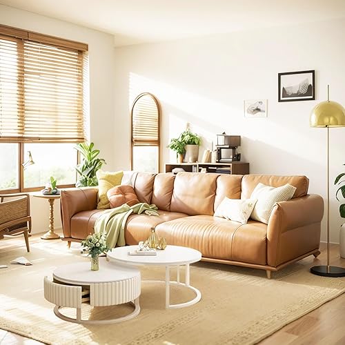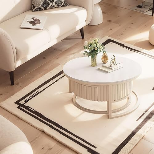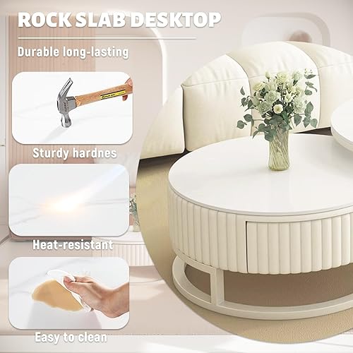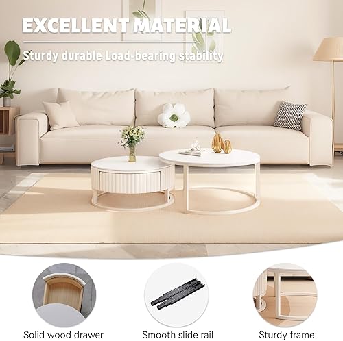 Ronde Table Basse Moderne Lot De 2 Blanche Avec Rangement - Table Gigogne Marbre Avec Tiroir Et Cadre Métallique Pour Salon, Chambre, Bureau