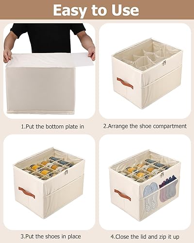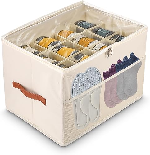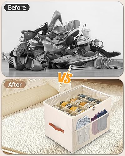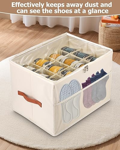 Goxiry Organisateur de chaussures peu encombrant avec couvercle transparent - Boîte à chaussures à 12 compartiments avec poche en filet et poignée de transport - Pour chaussettes, chaussures, baskets