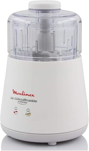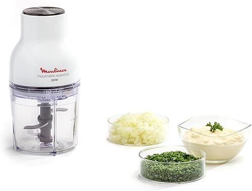 Moulinex Hachoir électrique, 400 ml, 300 W, 4 lames, Fonctions 3-en-1, Emince, Hache, Mixe, Système de pression simple, Moulinette Essential DJ520110, Blanc