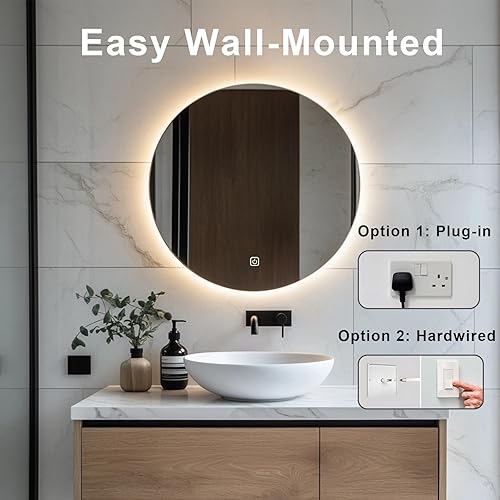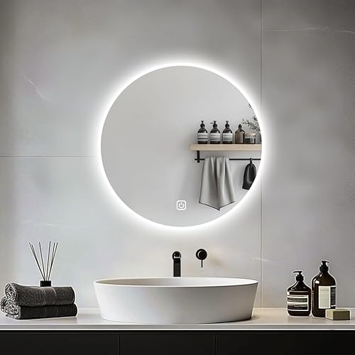JAMUBOCHE Miroir de salle de bain LED pour lavabo de salle de bain rond 50 cm avec lumières rétroéclairées pour le rasage de douche, montage mural sans buée, éclairage 3 couleurs, IP54