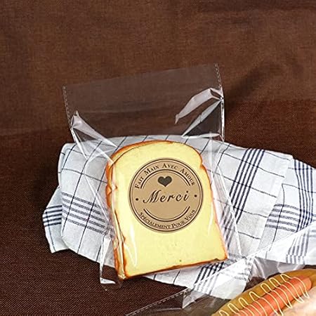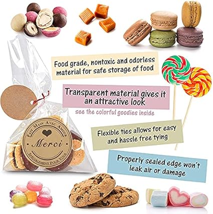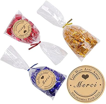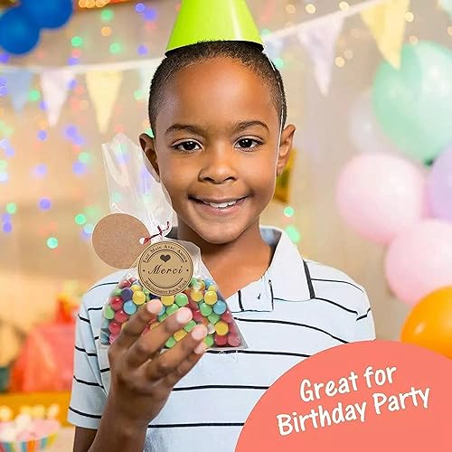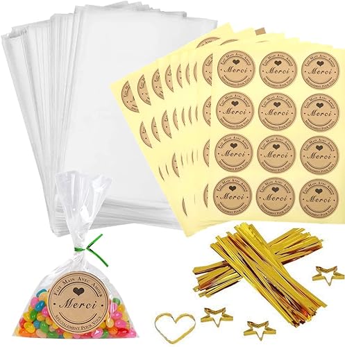 MKISHINE 100pcs Petit Sac Sachet Bonbon Pochette Transparents avec 100 Merci Étiquettes et Liens,Sachet Pochette Bonbon Transparent pour Emballage Chocolat Gâteau Confiserie 10 * 15cm
