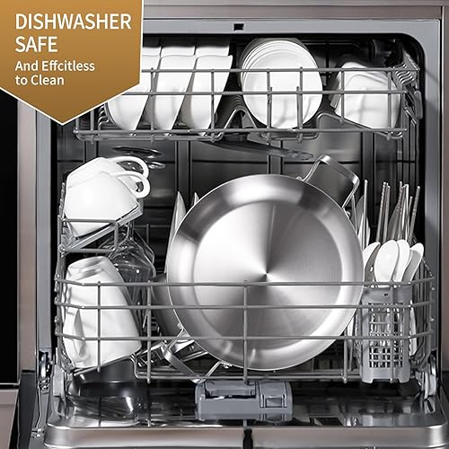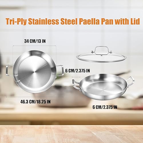 Inqibee Poêle à paella en acier inoxydable triple épaisseur de 33 cm avec couvercle, grille, grande poêle, poêle à induction, passe au lave-vaisselle et au four