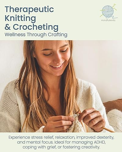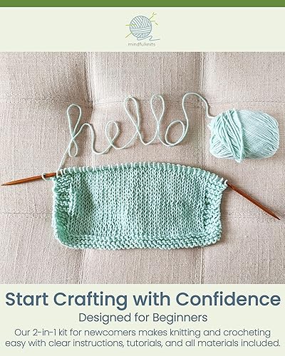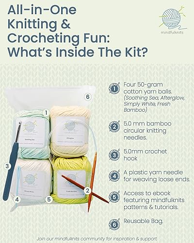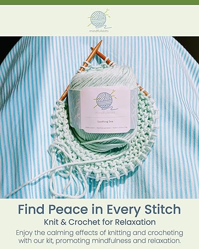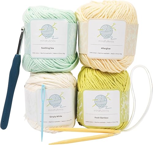 mindfulknits Kit de tricot pour débutant avec aiguilles à tricoter, aiguille à laine et fil à tricoter 100% coton (4) Ensemble de tricot de base Flora pour la relaxation et le soulagement du stress
