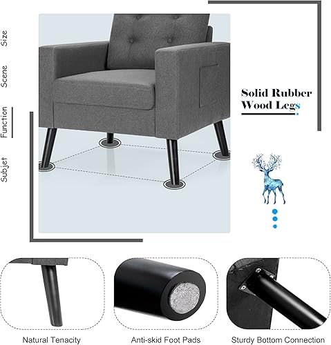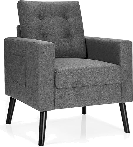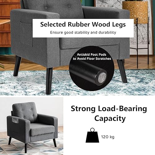 RELAX4LIFE Fauteuil rembourré, fauteuil de relaxation avec coussin de dossier et d'assise, canapé simple avec pieds en bois et 2 poches latérales, profondeur d'assise de 53 cm, pour salon, chambre à