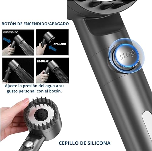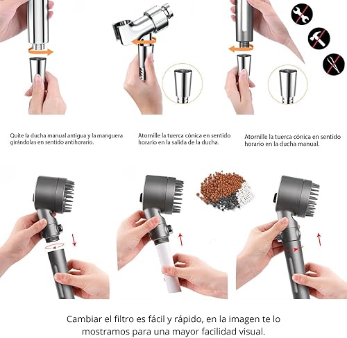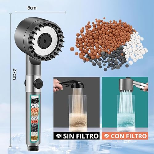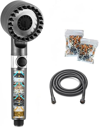 Pommeau de douche avec filtre anti-calcaire et chlore, haute pression 3 modes, tête de douche avec tuyau en acier inoxydable 1,5 m, support réglable et 3 pièces de rechange de pierres filtrantes