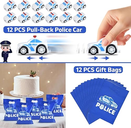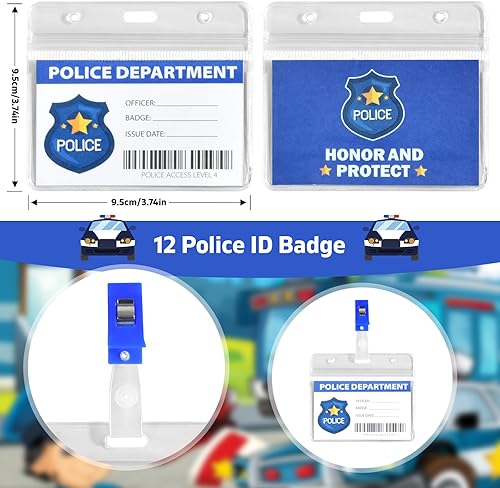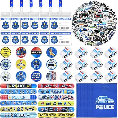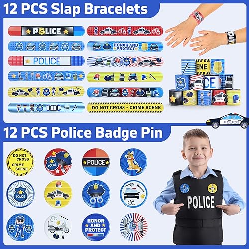 Lot de 110 décorations de fête d'anniversaire de police pour enfants – Décorations de fête d'anniversaire de police avec voitures jouets, bracelets Slap, autocollants, badges, cartes d'identité et