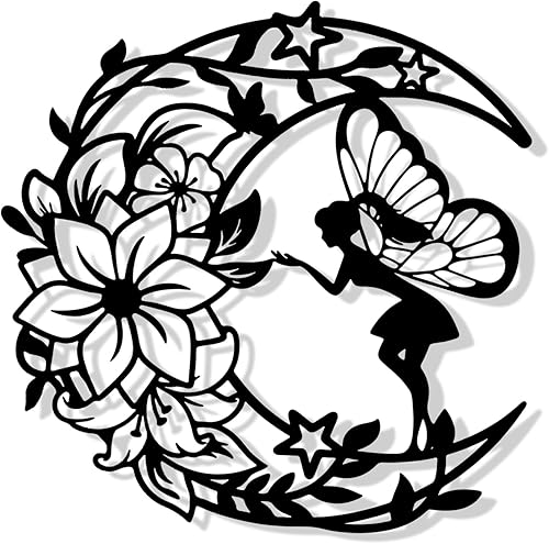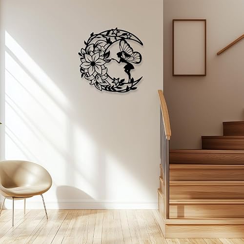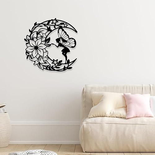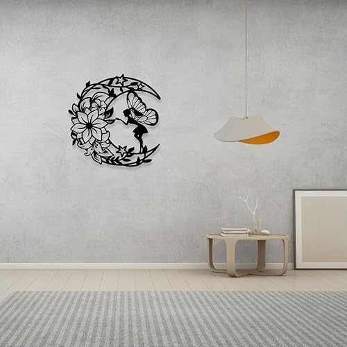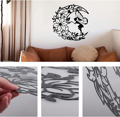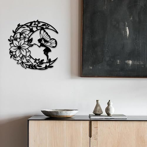 YunBey Décoration Murale Métal Noire Deco Murale en Métal de Fée de Fleur de Lune Sculptures Décoration Chambre des Filles Salon Jardin Salle de Bain (30 x 30 CM)