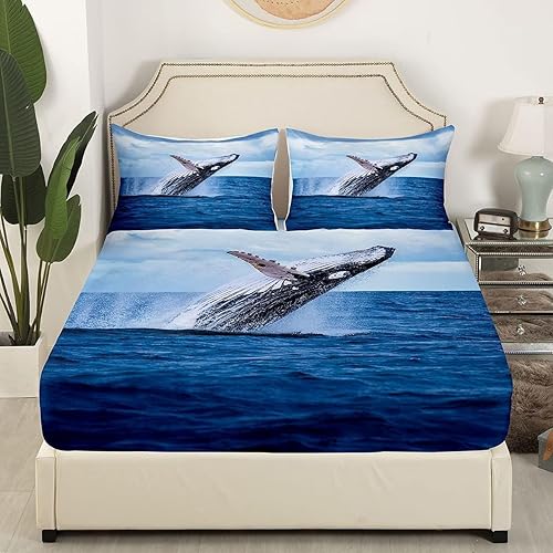 Drap Housse 90x190 cm Baleine, 3D Océan Bleu Drap-Housse en Microfibre, Drap Plat 1 Personne, Drap Housse avec 2 Taie d'oreillers pour Matelas Épais CL1994