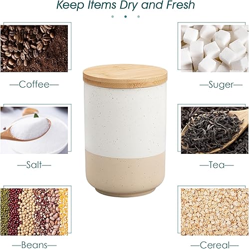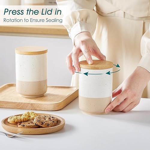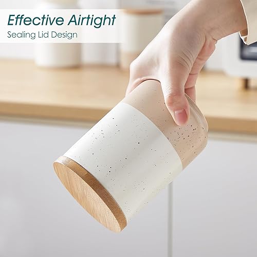 vancasso Sabine Lot de 4 boîtes en céramique avec couvercles hermétiques en bois – Petit rangement de cuisine pour café, sucre, thé et épices (510,3 g chacune) – Bocaux de comptoir compacts