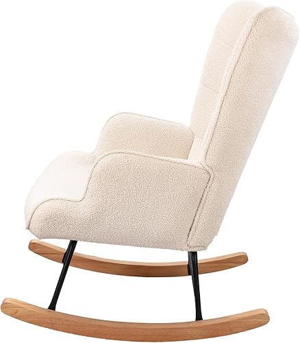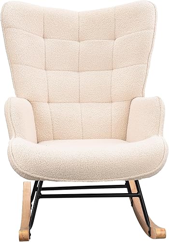 FEEOHOME Fauteuil à Bascule, Chaise à Bascule, Fauteuil Allaitement Chambre Bebe, Rocking Chair Allaitement, Velours Teddy pour Chambre à Coucher et Salon, Dossier à Carreaux (Beige)